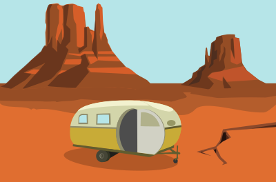An old camper wagon parked in the desert. It's made up of artworks from Glitch - glitchthegame.com - a video game that shut down and donated al its artworks to the public domain.