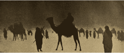 It looks like a bit of a sandstorm, but in any case you can see a bunch of guys with their camels in an endless desert. Not dessert though. Unless someone wants to eat a camel. Not a typical meal though I guess, although camel urine is a nice little treat if you are into that sort of thing. Wait, no I'm not joking. Camel pee and milk, yum yum. Hmm. Maybe I'm not thirsty anymore! But really. People drink that. Proof:
