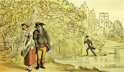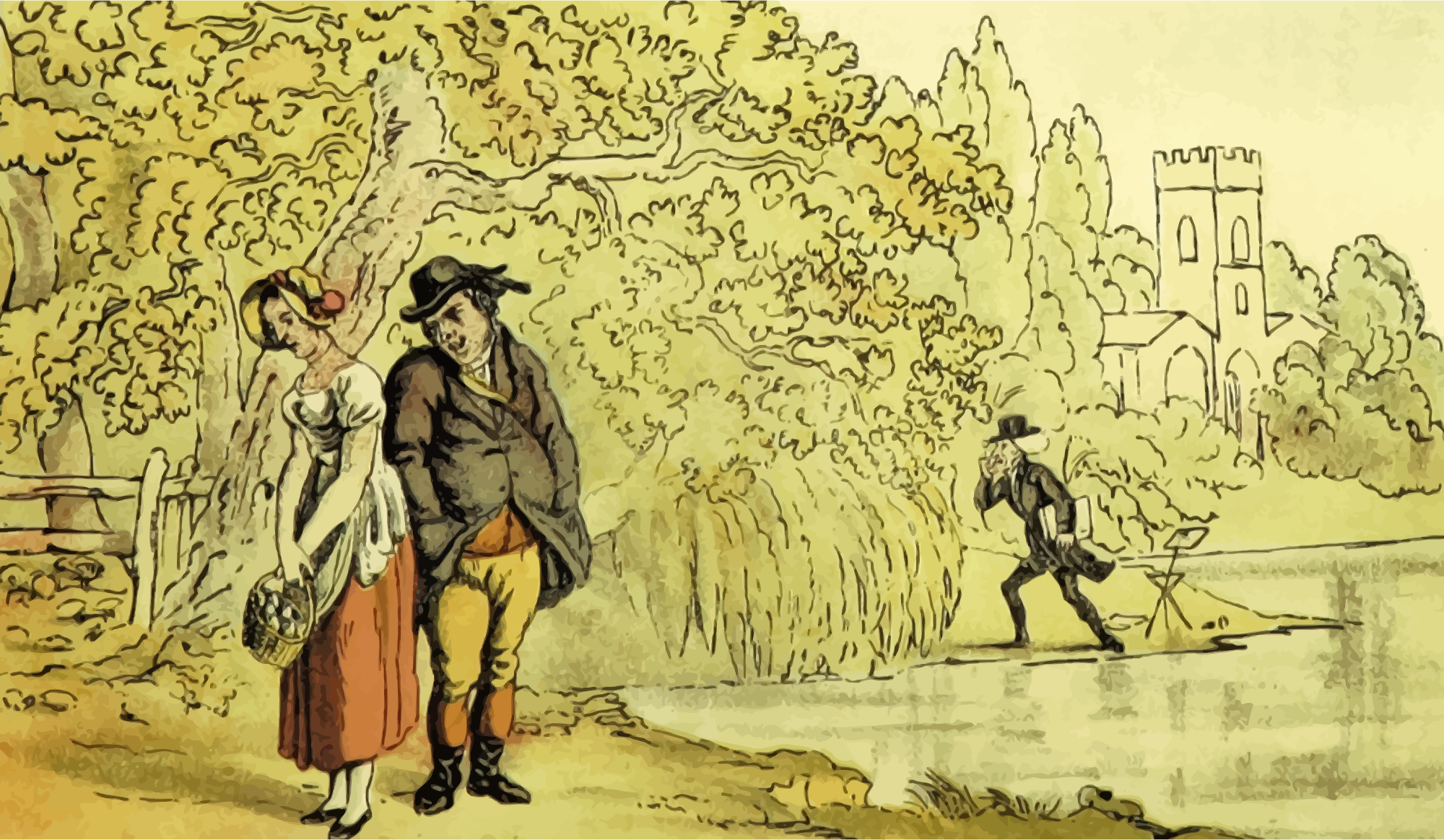 A couple chatting next to a lake with an older guy lurking in the background. Is he spying on them? A vectorization of a drawing in 'Doctor Syntax's Three Tours: in search of the picturesque, consolation, and a wife', William Combe, 1868. The drawing was entitled 'Dr Syntax Making a Discovery'. The raster image was processed to remove blemishes, and contrast and colours were adjusted before vectorization.