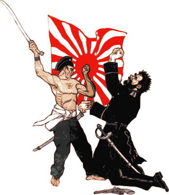 The Russo-Japanese War was from 1904 to 1905. According to wikipedia, the fledgling Japanese military consistently attained victory over the Russian forces arrayed against them, which was unexpected by world observers. I extracted and colored this image from a picture illustrating a story written by Adachi Kinnosuke in The Washington Times, April 24, 1904. Without a question, this image is in the public domain.