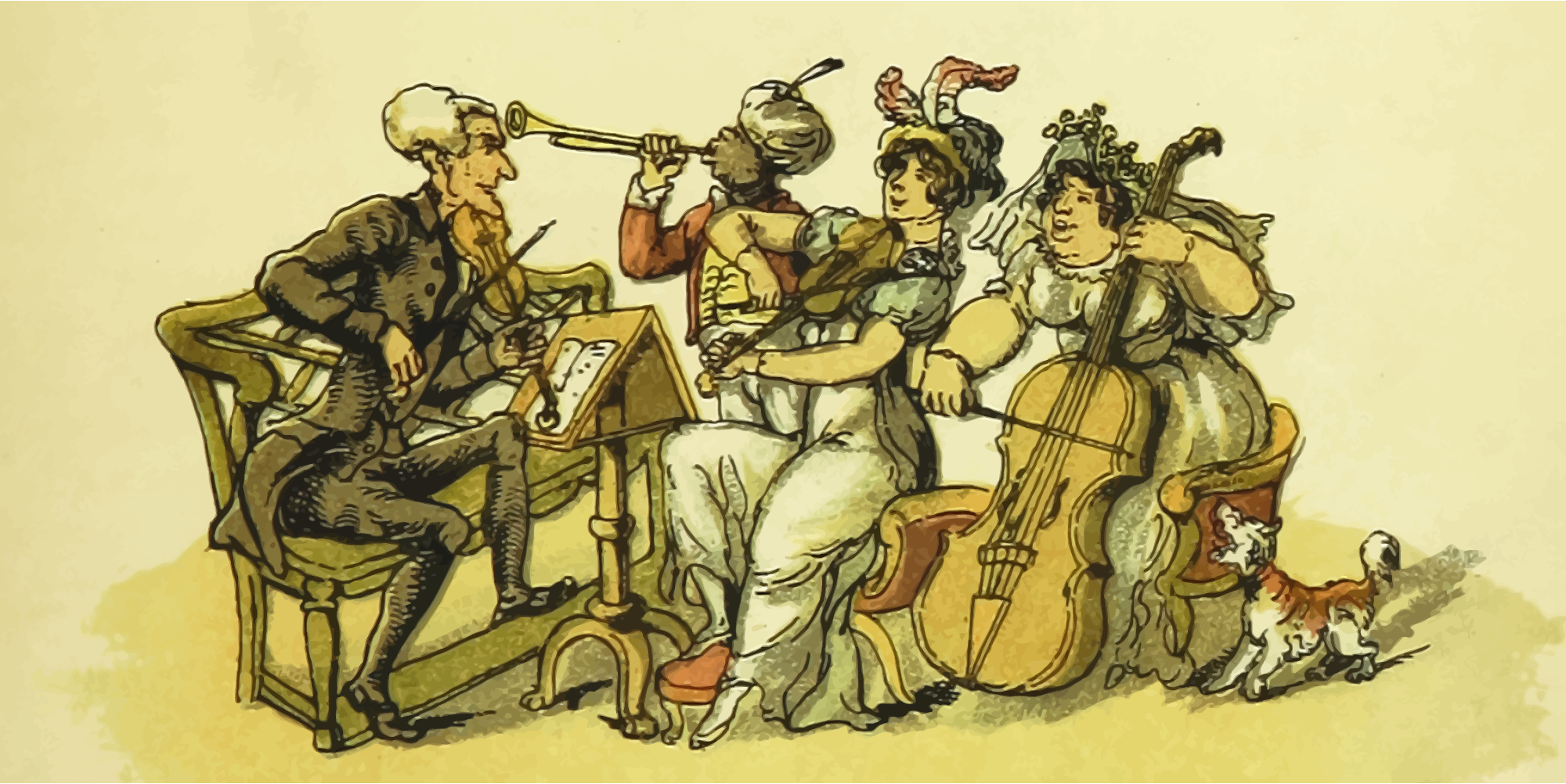 A lively quartet performs a piece with a dog accompanying on vocals. A vectorization of a drawing in 'Doctor Syntax's Three Tours: in search of the picturesque, consolation, and a wife', William Combe, 1868. The raster image was processed to remove blemishes, and contrast and colours were adjusted before vectorization