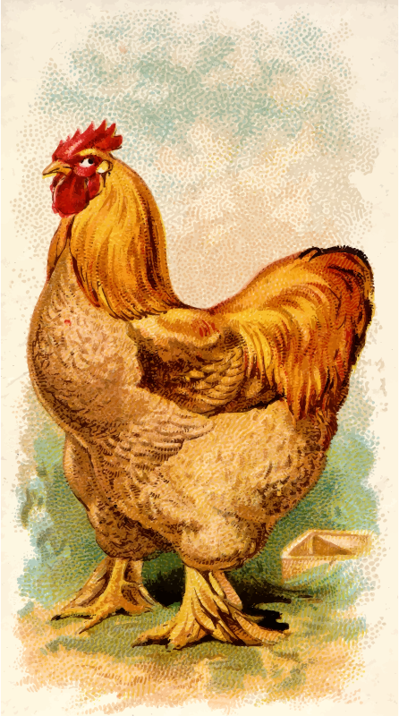 One of the "Prize and Game Chickens" series of cigarette cards from Allen & Ginter, late 1800s. Due to their age I have done a little restoration where needed and also cropped them to just the picture, adjusted contrast, brightness and colour saturation. The originals can be found on the New York Metropolitan Museum of Art web site.