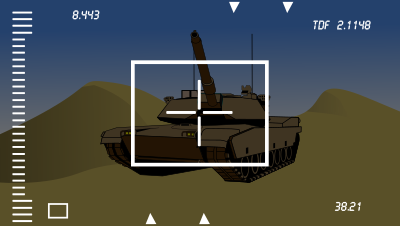 View from camera of a missile or smart bomb showing a desert landscape and the target - a tank.
