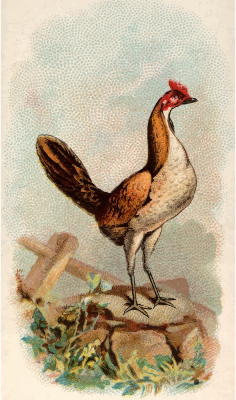 One of the "Prize and Game Chickens" series of cigarette cards from Allen & Ginter, late 1800s. Due to their age I have done a little restoration where needed and also cropped them to just the picture, adjusted contrast, brightness and colour saturation. The originals can be found on the New York Metropolitan Museum of Art web site.