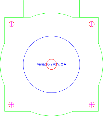 Single-phase variac 0-270 V, 2 A. Centre red hole 12 mm, four fixing screw holes of dia 6.4 mm with centre-to-centre distance of 92 mm. Blue circle indicates knob of dia 65 mm.