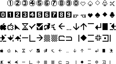 Retro style icons, pictographs, cursors (etc.) via the Mouse Text font from Font Mechanic. Partially based on the mouse text font from the Apple IIc and enhanced Apple IIe computers. Font Mechanic (by Beagle Bros) was a companion app for Apple Mechanic. Apple Mechanic was a shape table editor for the Apple II line of computers. Shape tables are somewhat similar to hardware sprites. Beagle Bros folded in 1991 and their software was released as freeware in the mid 1990s.