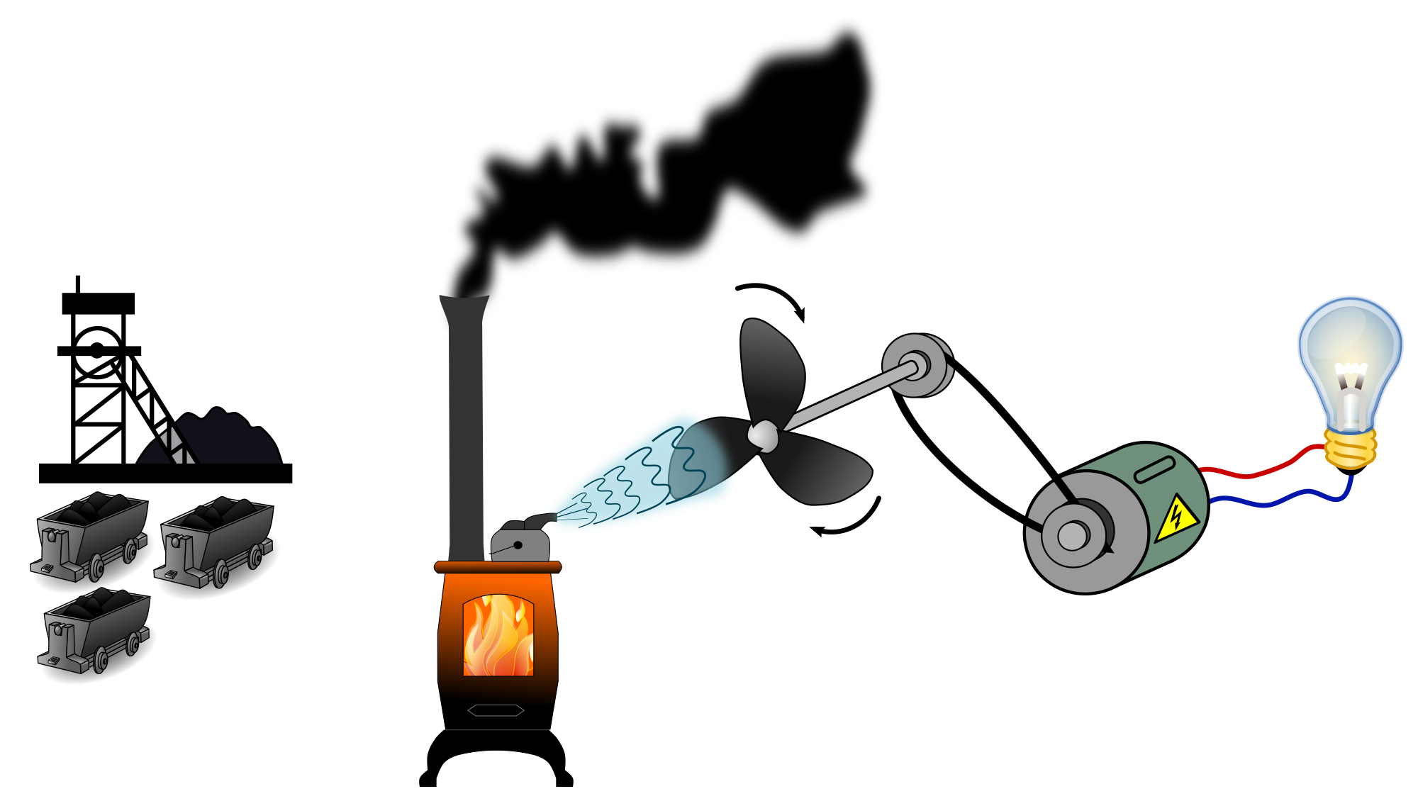 simple diagram of coal thermal power plant with coal mine,combustion furnace represented with stove, simple fan representing the turbine converting steam power via dynamo/motor to electricity and a light bulb