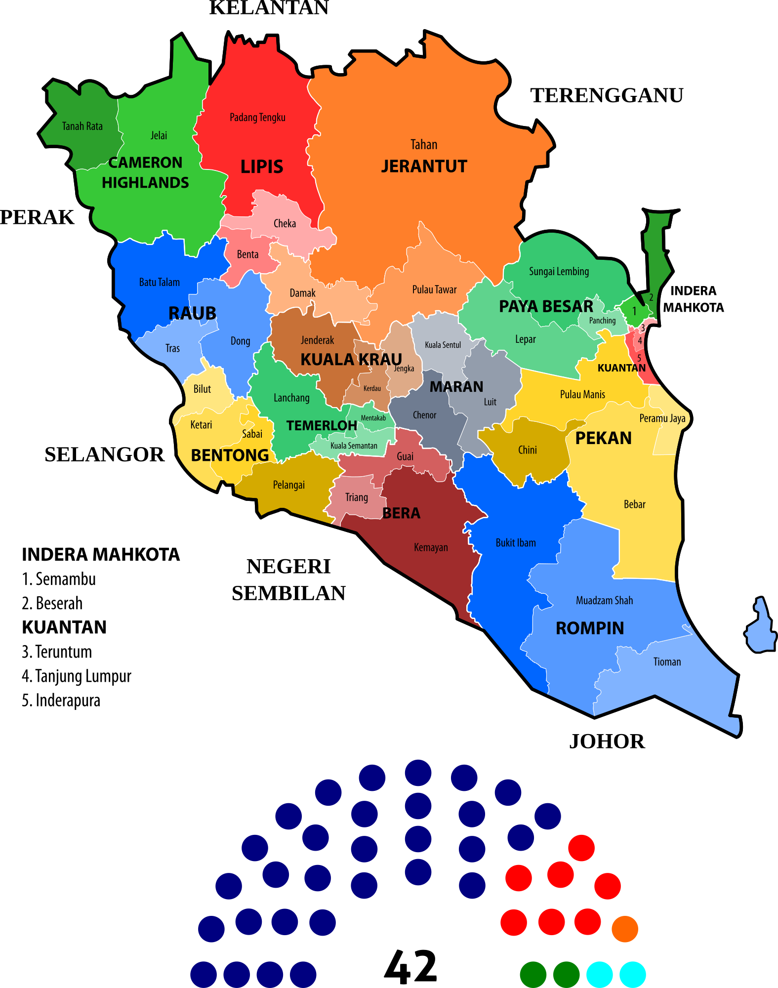 Constituencies of the Pahang State Legislative Assembly, Pahang, Malaysia. Fine-tuned borders and added seat composition.