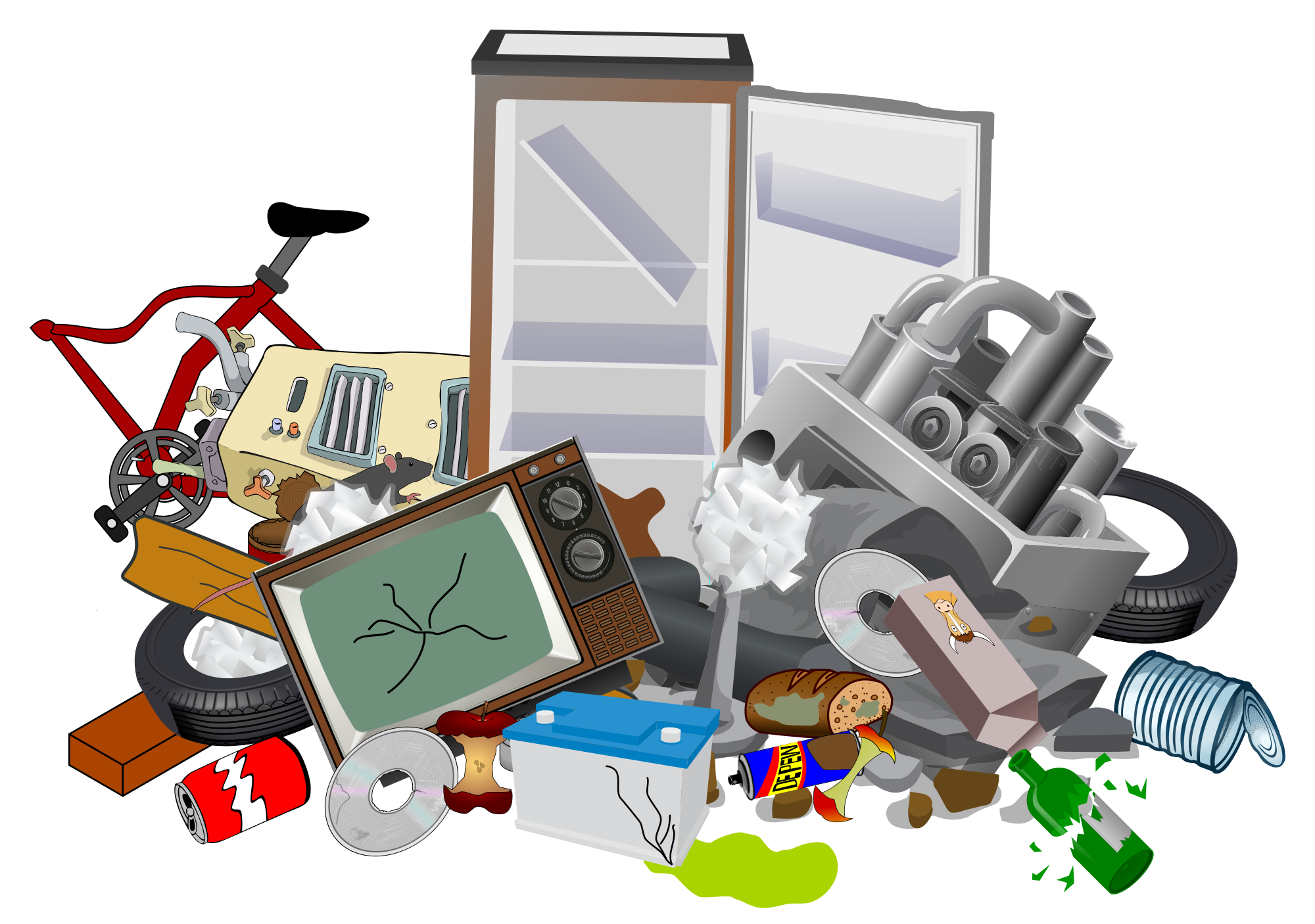 Pile of mixed garbage - old electronics, scrap metal, mouldy food, leaking car battery, cans etc. The worst sort of "common" waste.
