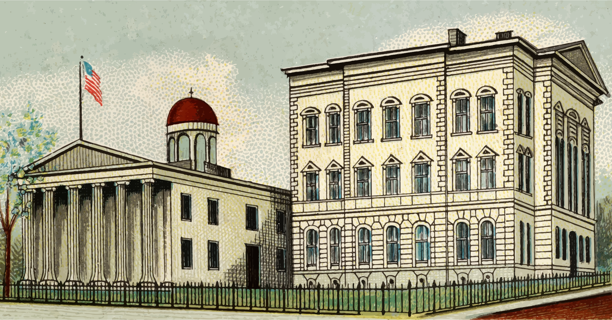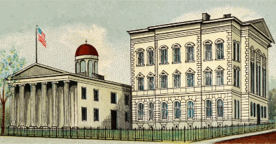 One of the "General Government and State Capitol Buildings" series of cigarette cards from Allen & Ginter, late 1800s. Due to their age I have done a little restoration where needed and also cropped them to just the picture, adjusted contrast, brightness and colour saturation. The originals can be found on the New York Metropolitan Museum of Art web site.
