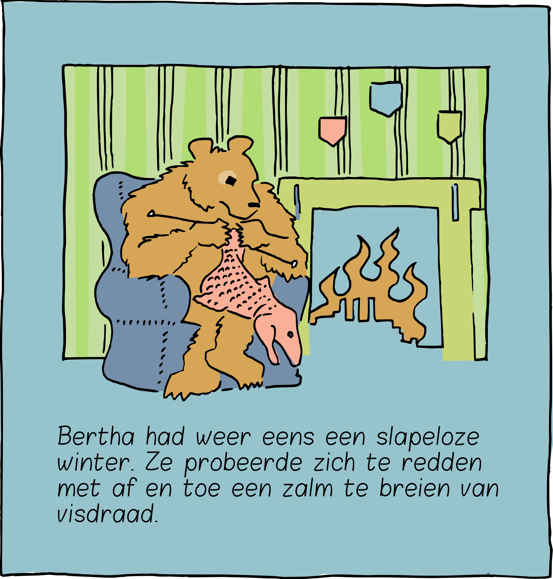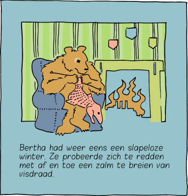 A cartoon of an insomniac bear trying to survive a cold winter by knitting some salmon to eat.
