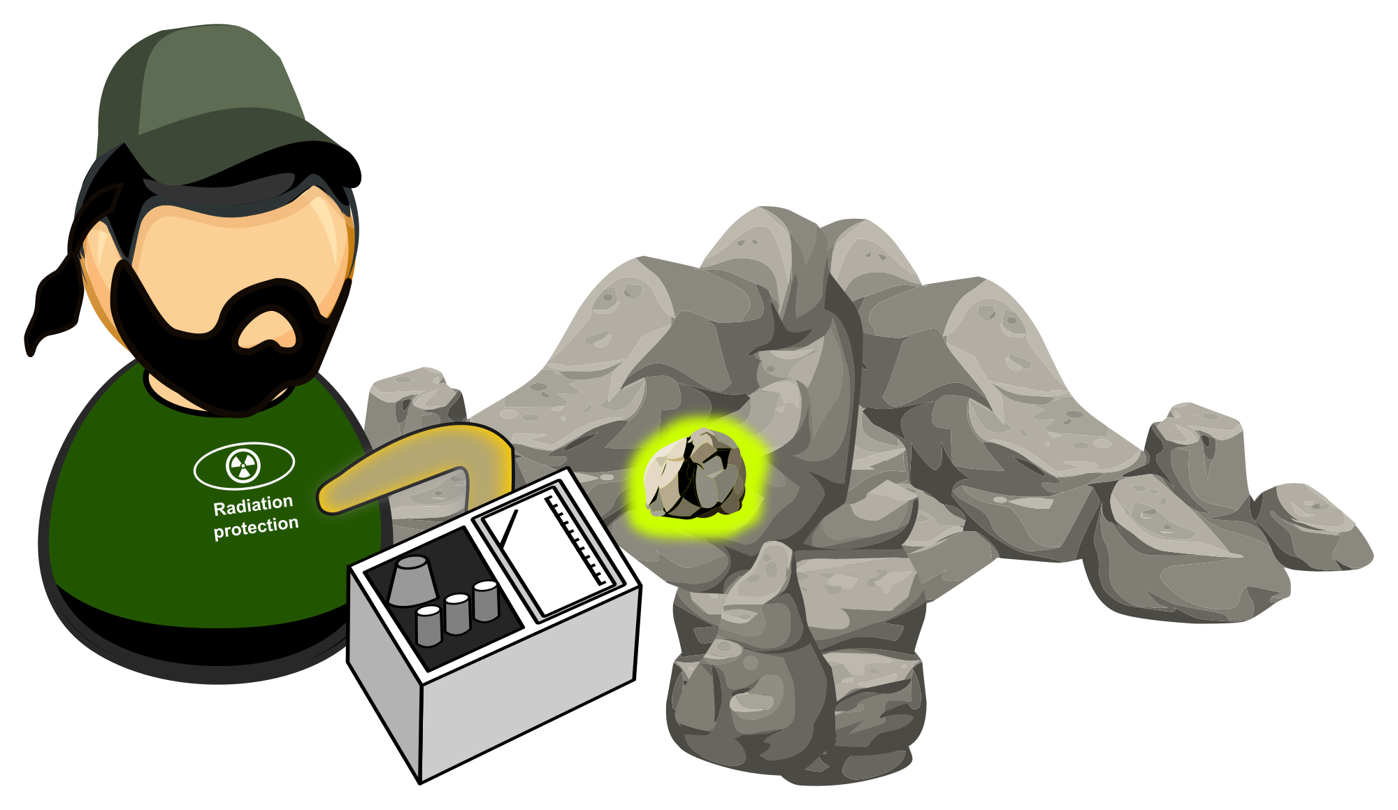Bearded guy holding a detector (Geiger counter) and measuring rocks, probably on a mining dump / heap. The glowing stone with black parts could be uraninite (pitchblende) - uranium ore.