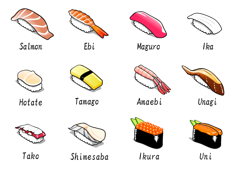 Various types of nigiri sushi. This image was adapted from a picture posted to gahag.net. All of the images on this site are in the public domain i.e. CC0. This site is only in Japanese but can be easily navigated with Google Translate.
