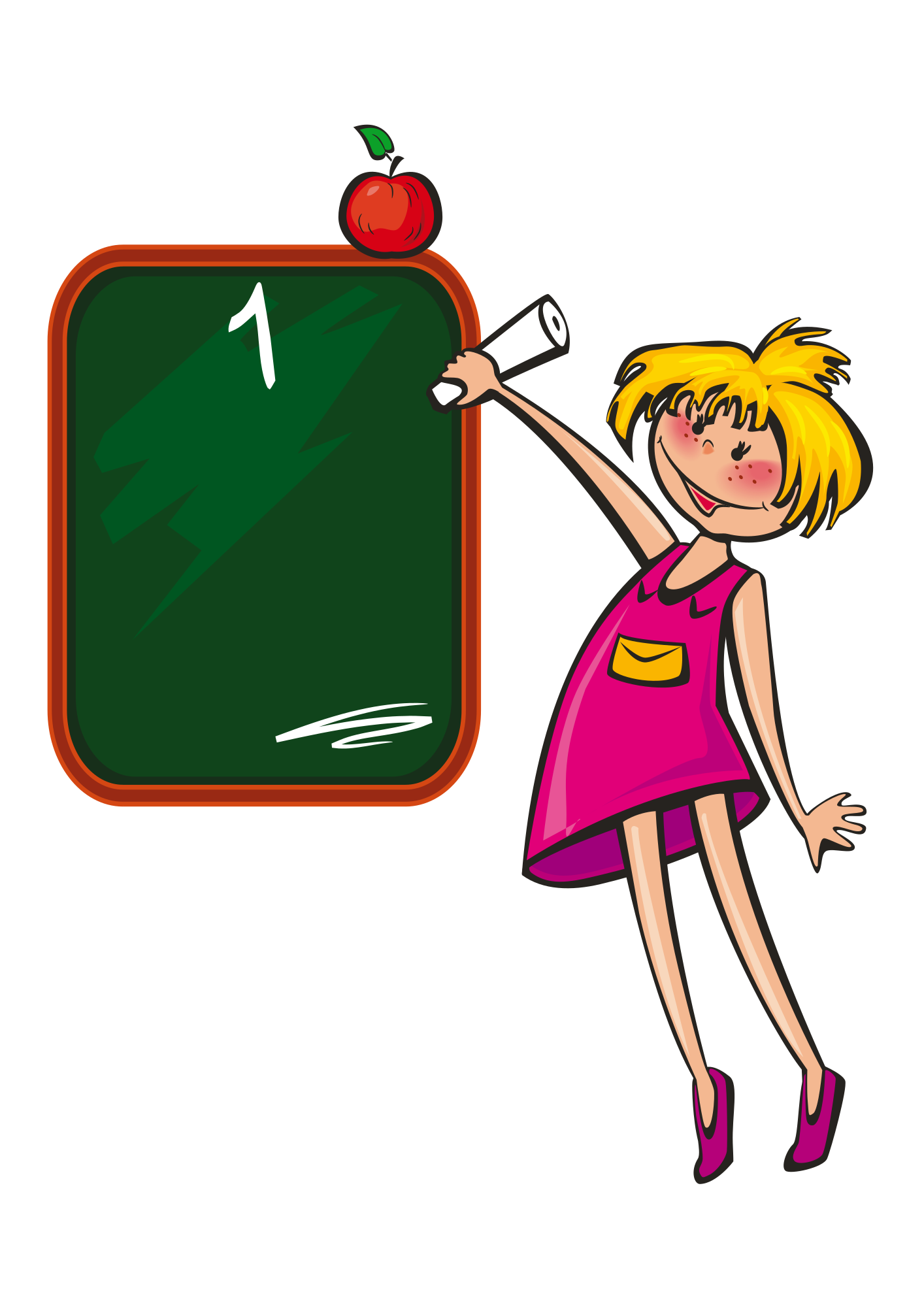 Girl writing 1 september on blackboard with chalk.
