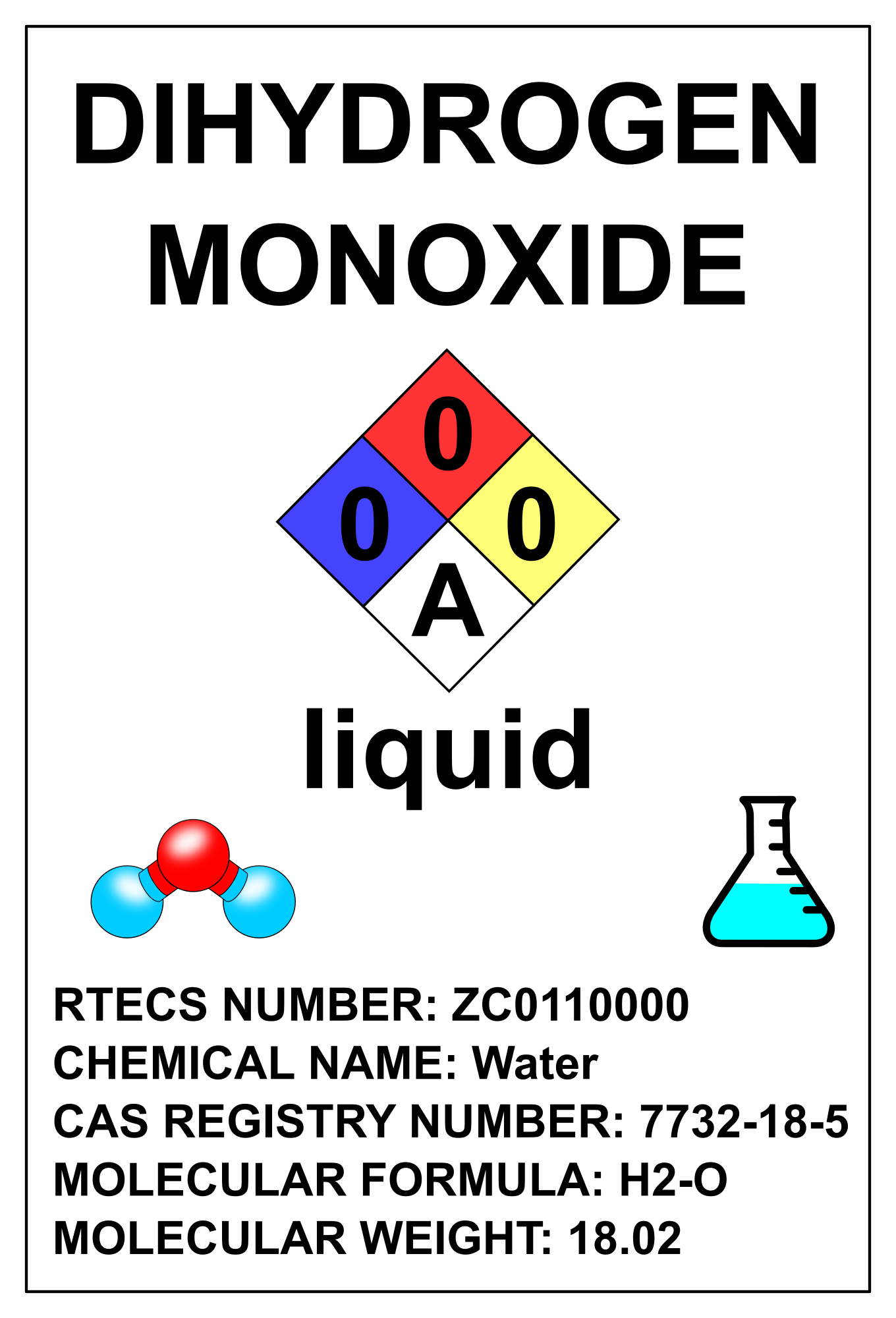 Following the jokes related with mystical "dihydrogen monoxide" chemical which is just common water I created this label. I took the numbers and NFPA symbol data from real laboratory document so it should be correct.