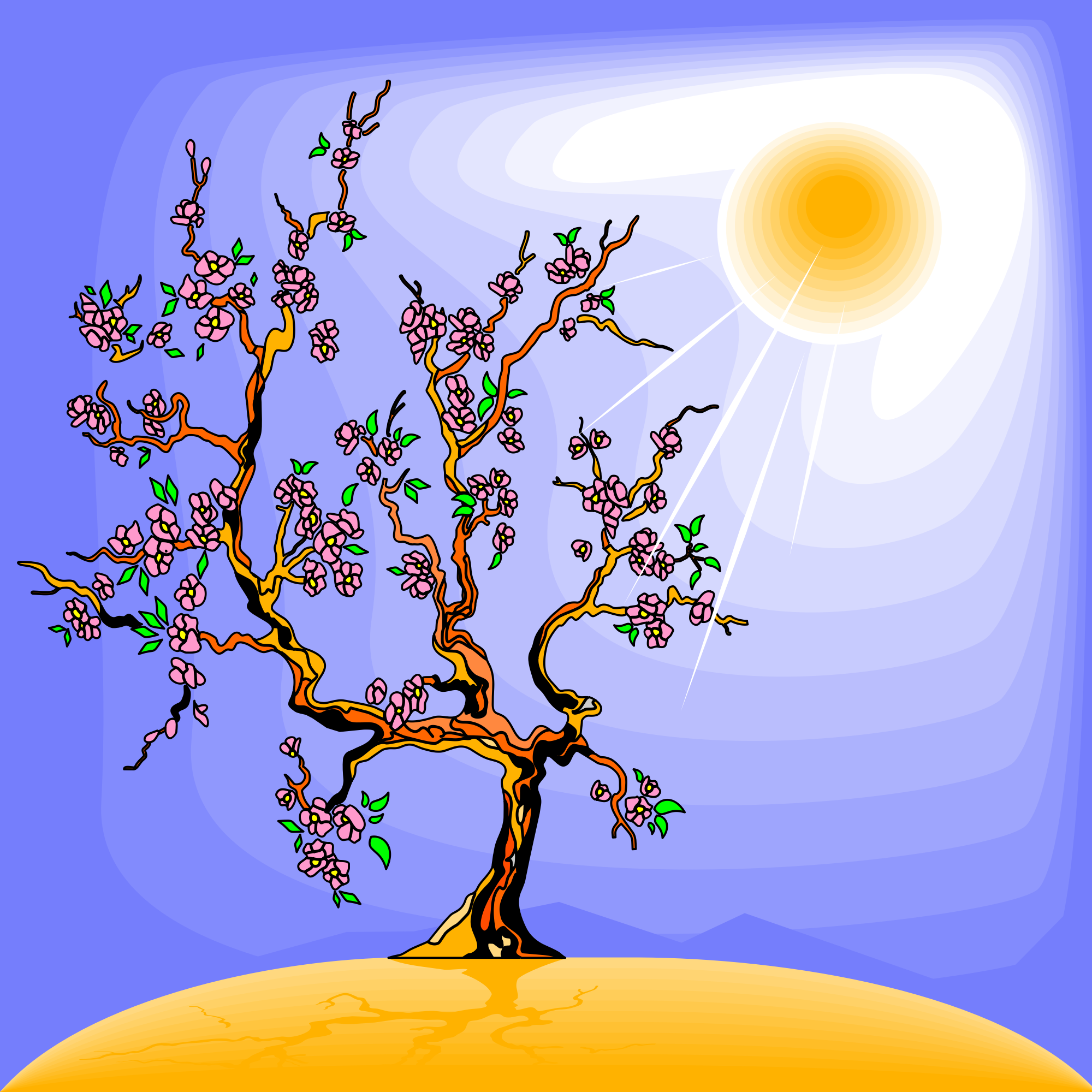 Japanese tree with flowers and a sun.