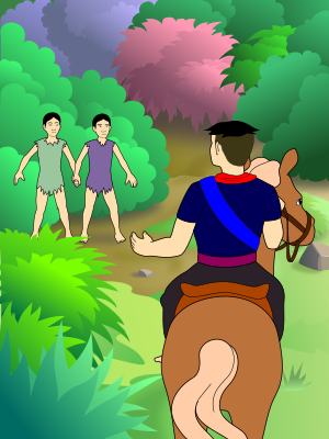 Thái tử phát hiện hai con gái mô côi trong rừng và hỏi họ nhà ở đâu. Bởi mẹ nuôi là con chó, họ không biết ngôn ngữ nào của con người.