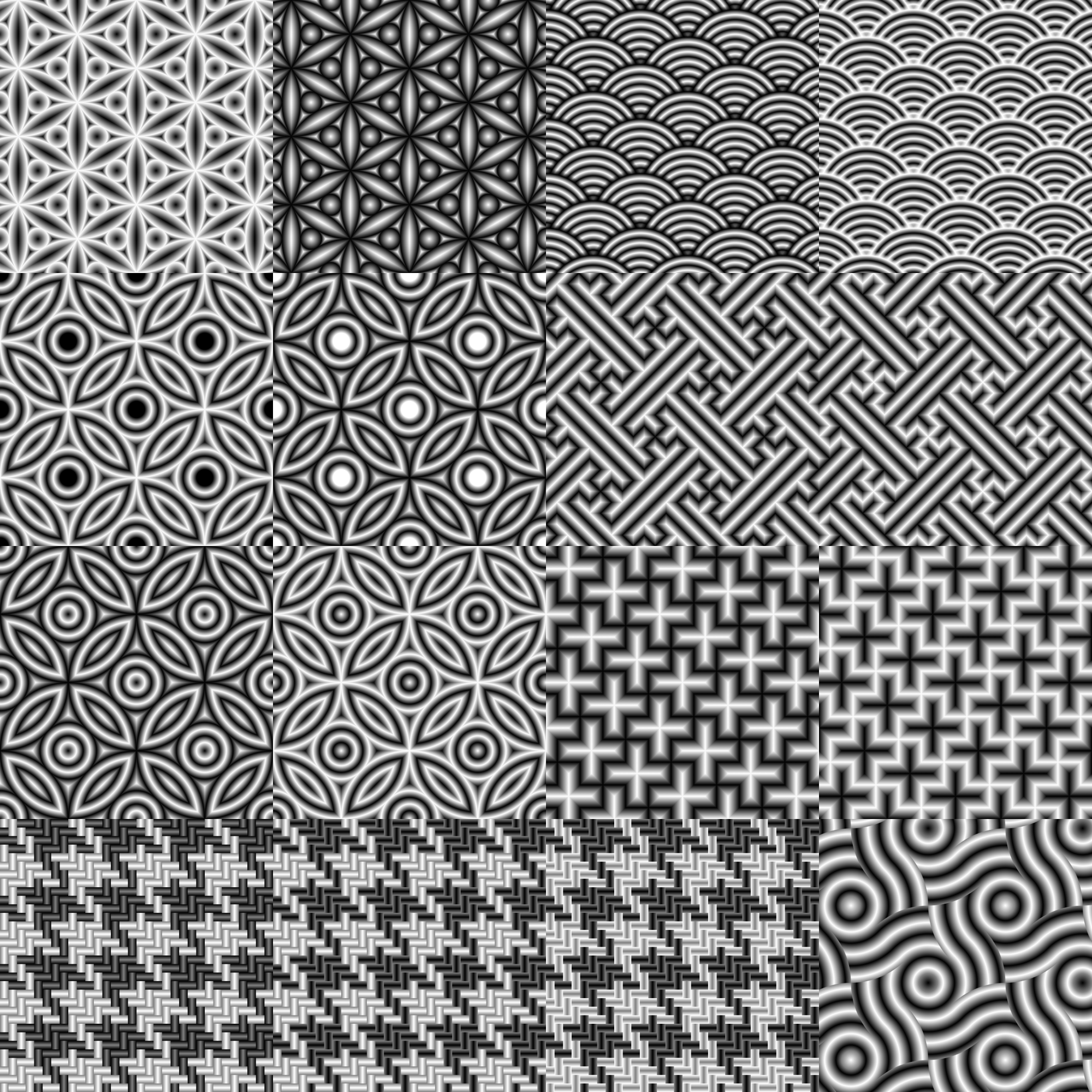 A set of black and white gradient filled patterns. Japanese wave, sayagata, wave-dot, circle seed, seed of life, cross and houndstooth in both positive and negative.