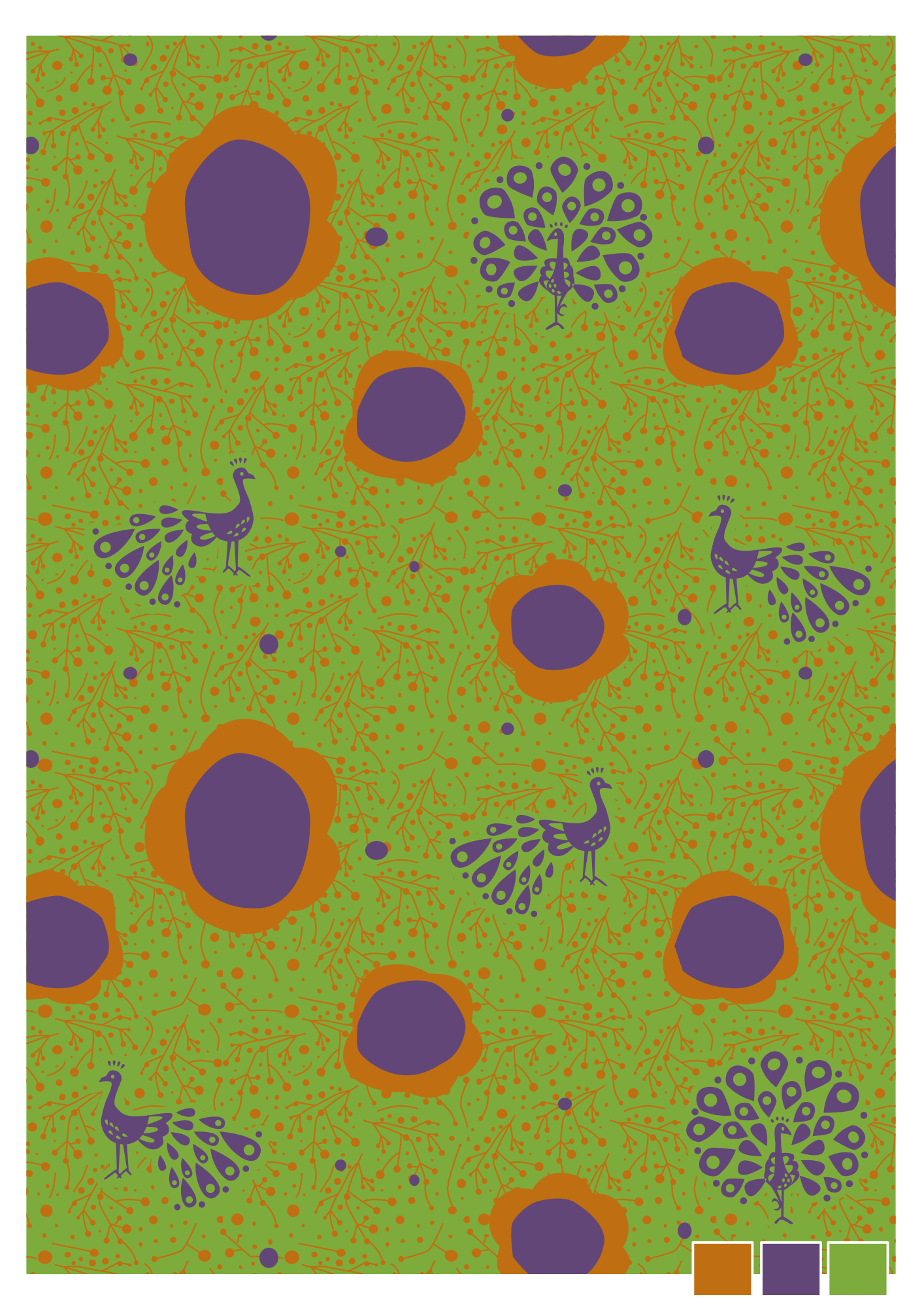 A vintage textile pattern featuring peacocks in a floral garden.