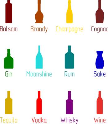 Alcoholic drinks in typical shape bottles.
