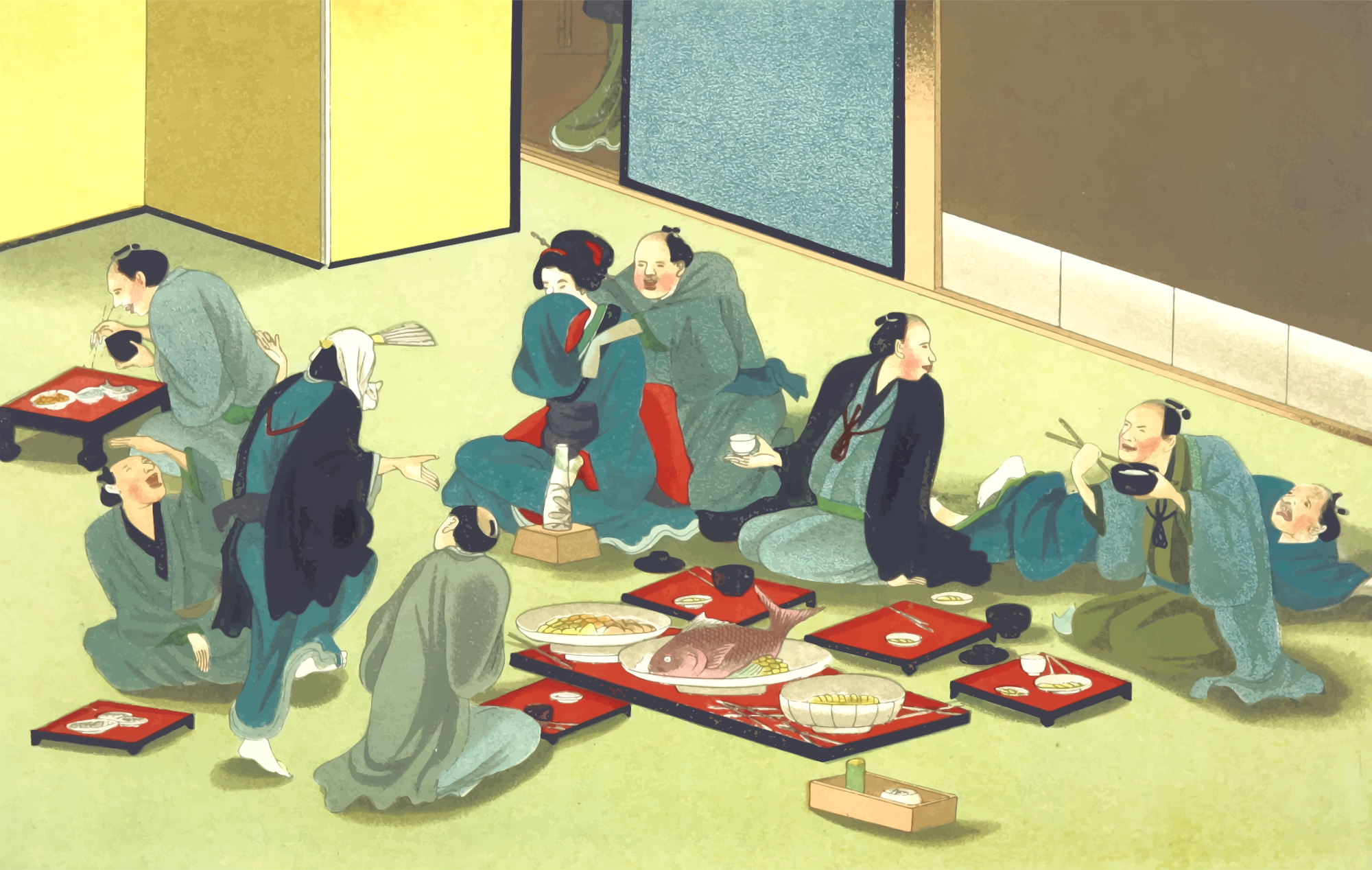 From a drawing in 'Sketches of Japanese Manners and Customs', Jacob Silver, 1867. A tea house merry making.