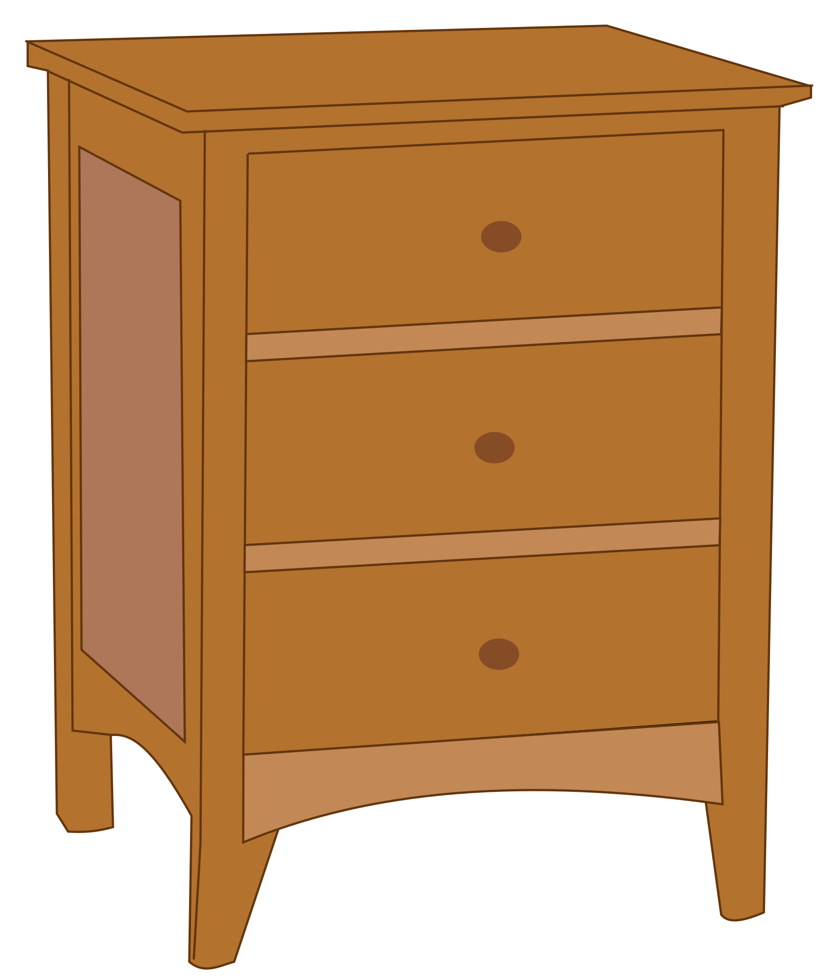 A typical 3-drawer endtable, a type of small dresser, a piece of furniture found in a bedroom.