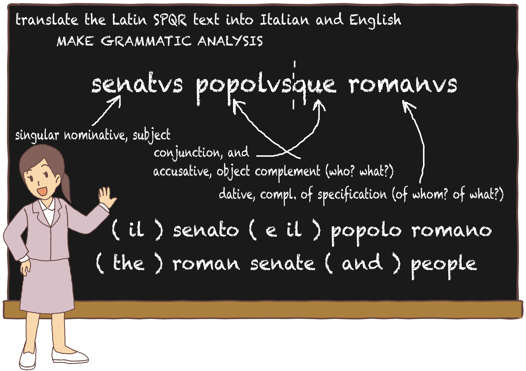 English lesson with Latin translation and grammatical analysis.