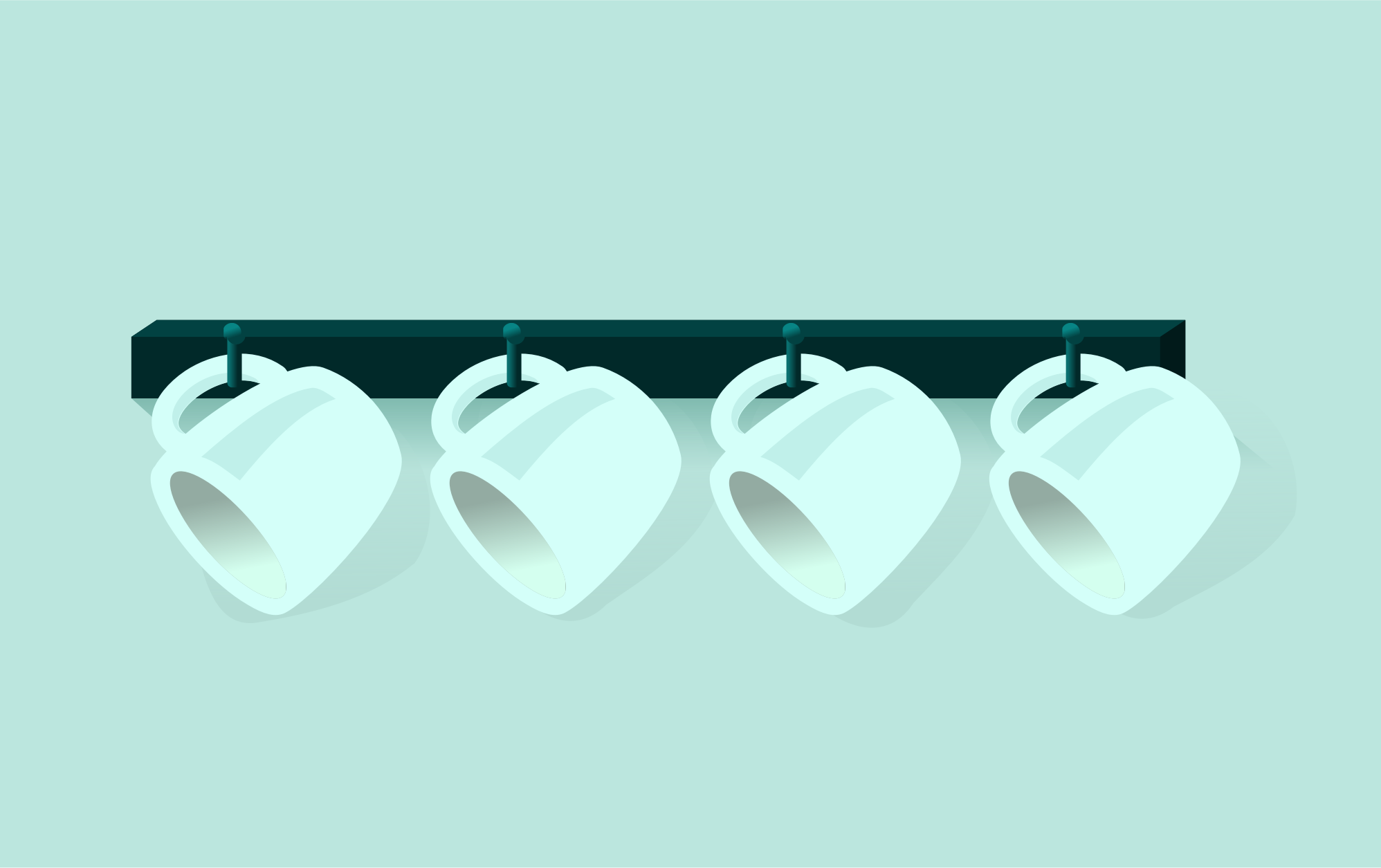 Four white coffee cups hanging from hooks.