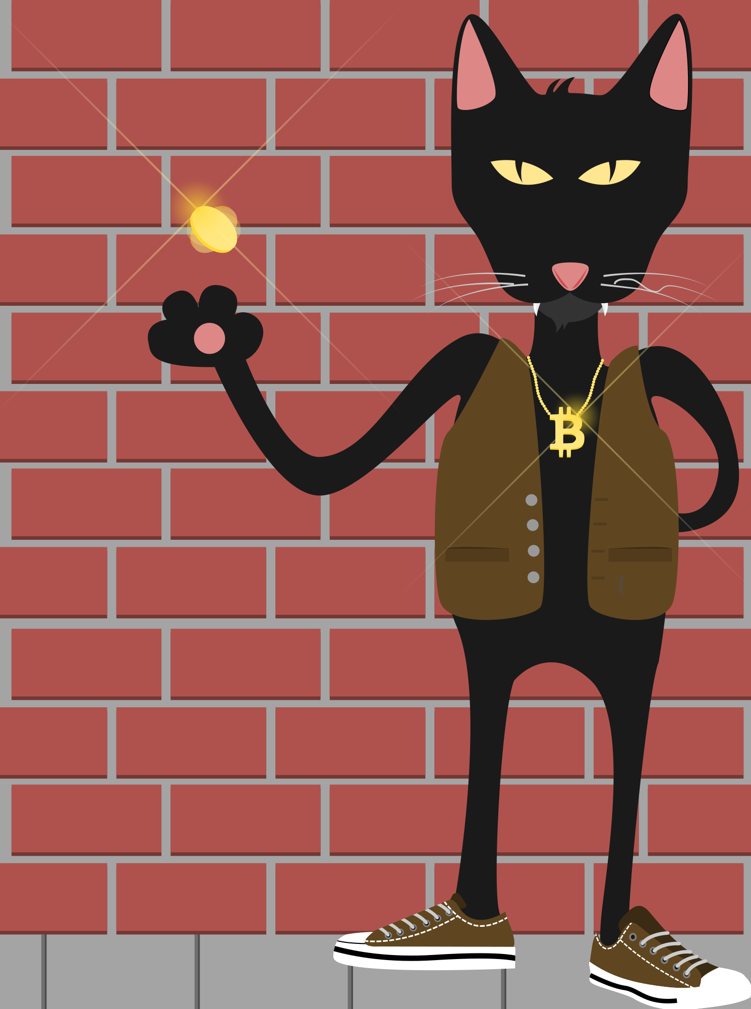 A bitcoin trader cat flipping a coin waiting for something.