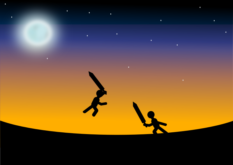 Two men fighting with swords.