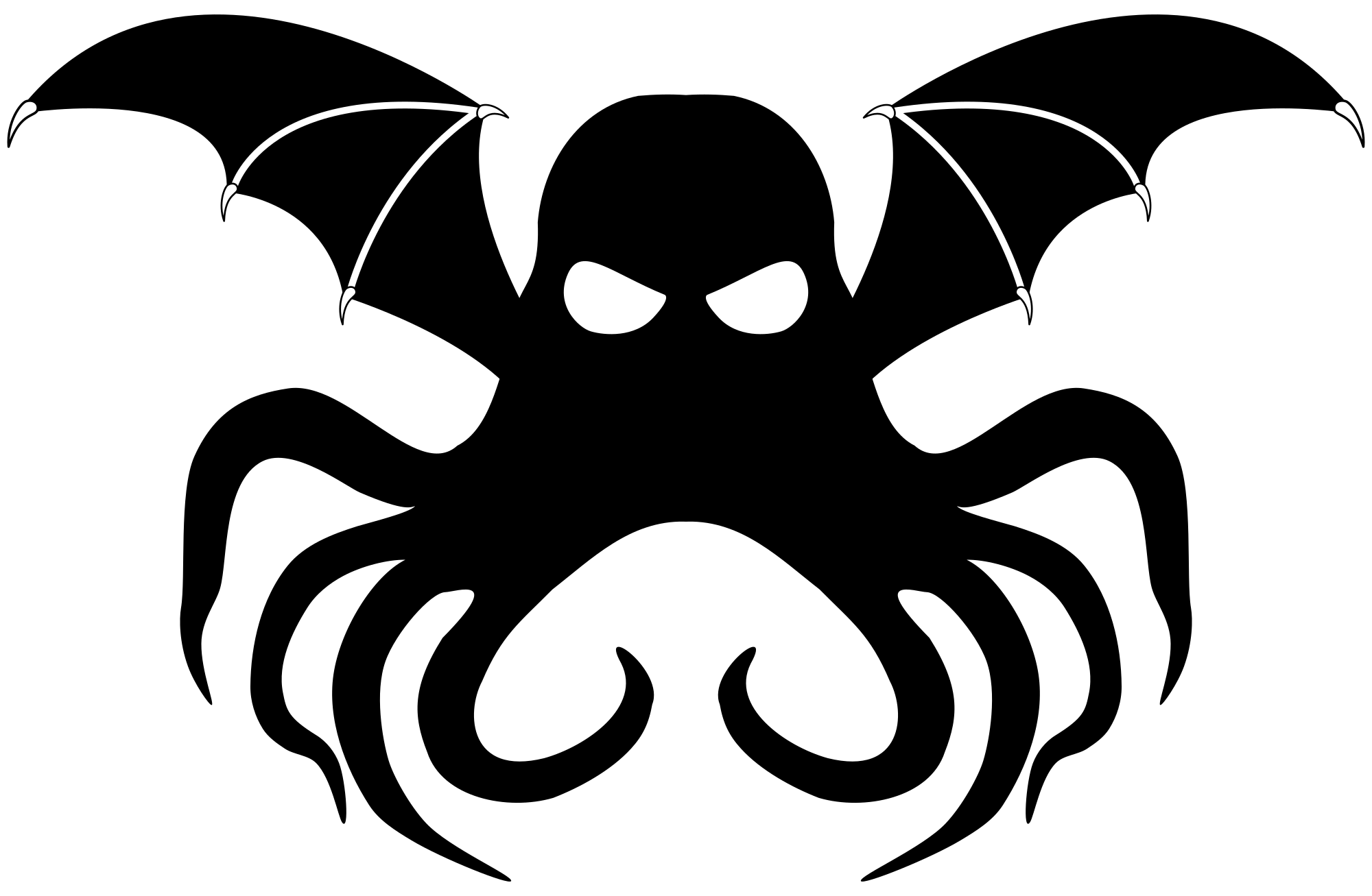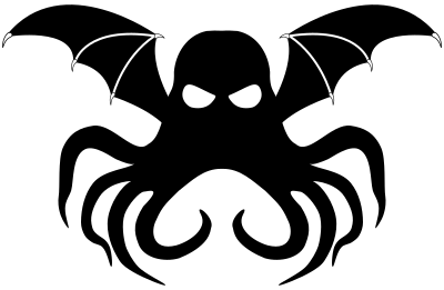 Simplified symbol od Cthulhu, fictional ancient evil monster, described by H. P. Lovecraft as "A monster of vaguely anthropoid outline, but with an octopus-like head whose face was a mass of feelers, a scaly, rubbery-looking body, prodigious claws on hind and fore feet, and long, narrow wings behind." ( https://en.wikipedia.org/wiki/Cthulhu )