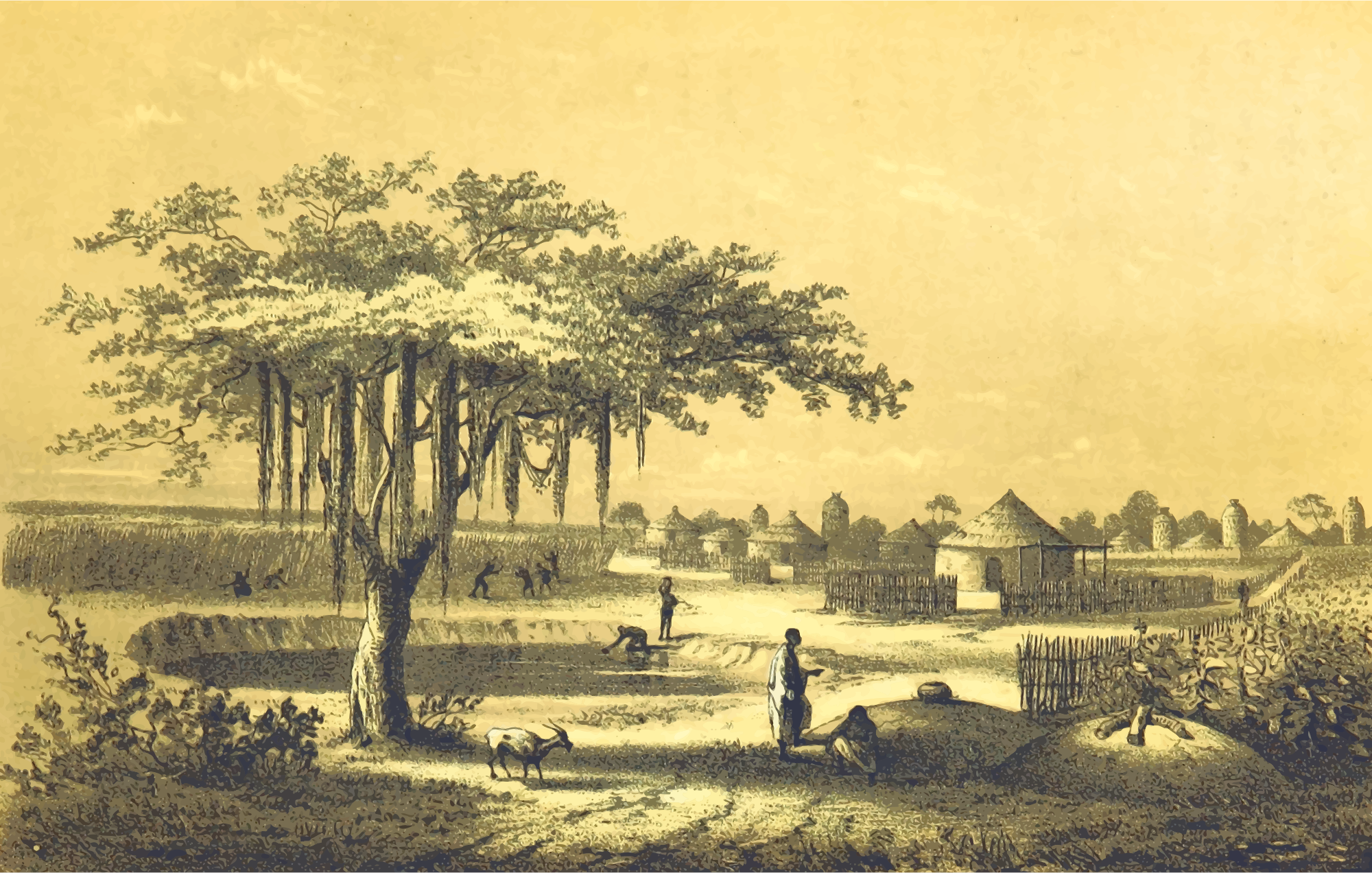 From a drawing in 'Travels and Discoveries in North and Central Africa: being a journal of an expedition undertaken under the auspices of H.B.M.'s Government, in the years 1849-55', Heinrich Barth, 1857. This 5-volume set had around 50 colour plates featuring African scenes. I mean to upload vector versions of all of them over the next few days.