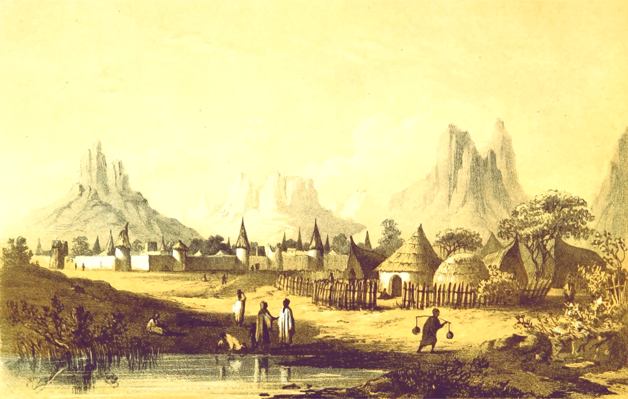 From a drawing in 'Travels and Discoveries in North and Central Africa: being a journal of an expedition undertaken under the auspices of H.B.M.'s Government, in the years 1849-55', Heinrich Barth, 1857. This 5-volume set had around 50 colour plates featuring African scenes. I mean to upload vector versions of all of them over the next few days.