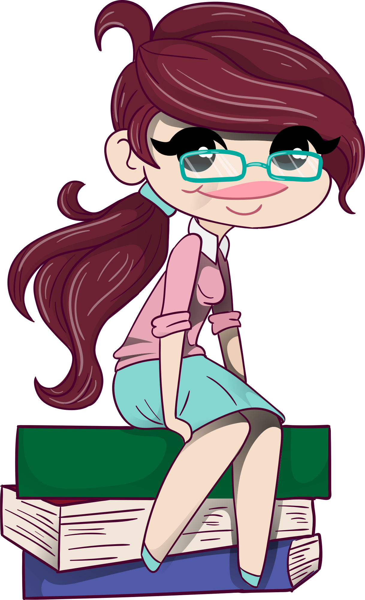 - book books eyeglasses female girl lady people - cartoon - cute read reading sit student woman young teenager nerdy student school university college ponytail