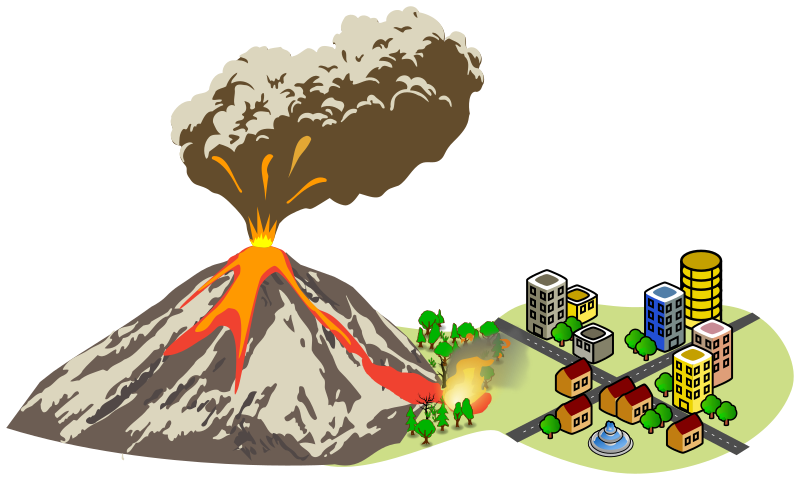 Volcano erupting near a city, with lava flow causing forest fire and approaching the city.