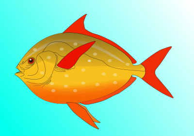 A yellow fish with red fins.