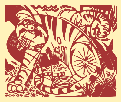 This is a beautiful 1912 art piece "Tiger" made by Franz Marc. (I added the colours while synthesizing it, just felt like making it a bit bolder.)