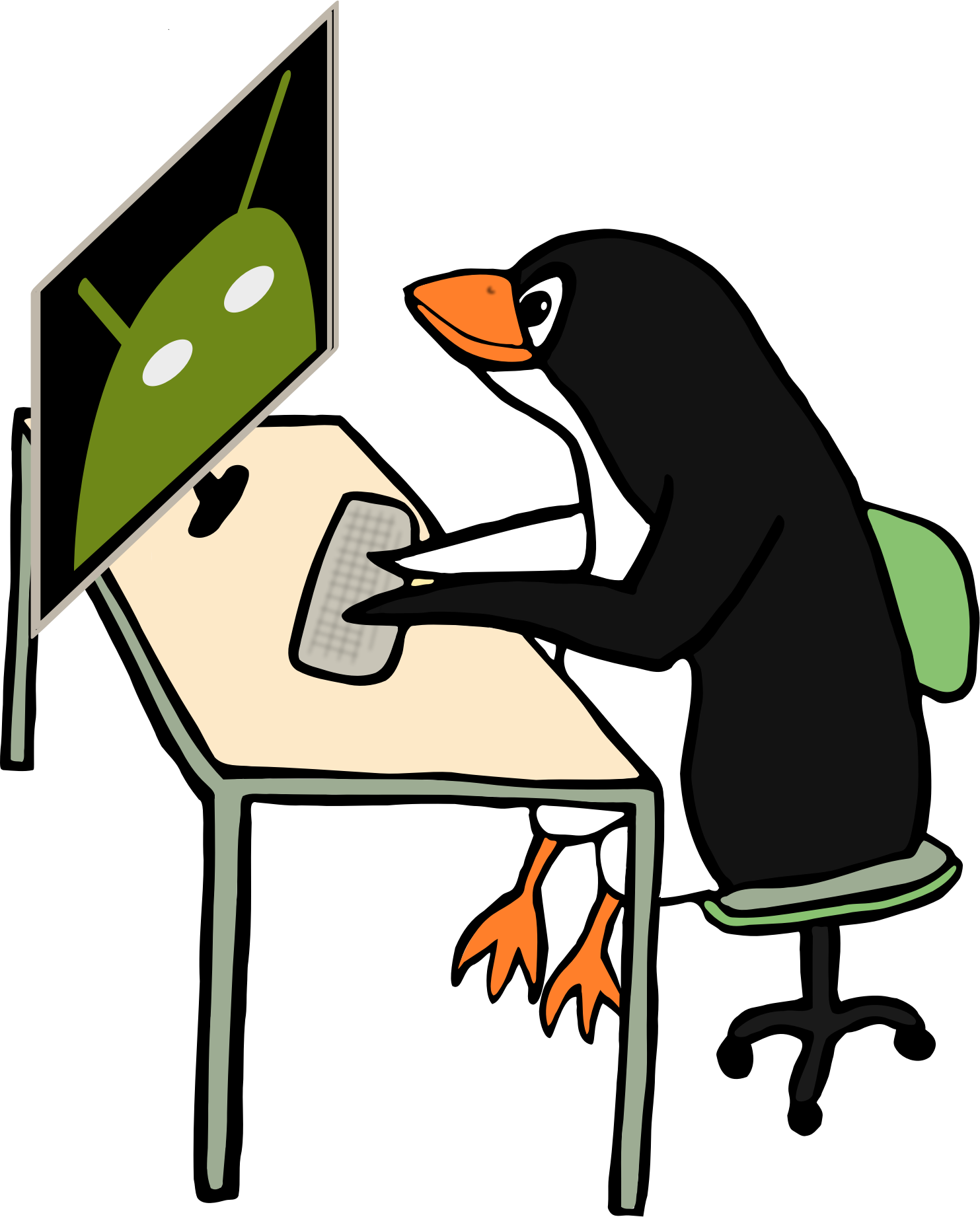 Penguin sitting at the computer, android on the screen. This was used in the presentation of my thesis (https://gsantner.net/projects/#ba_thesis).