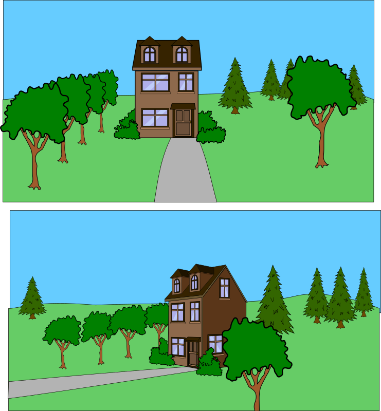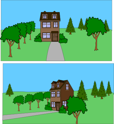 2 views of a house with sidewalk and trees in the yard, makes a great backdrop or establishing setting for comic scenes! Components can be moved, flipped and rearranged for additional versatility and customization for your comics!