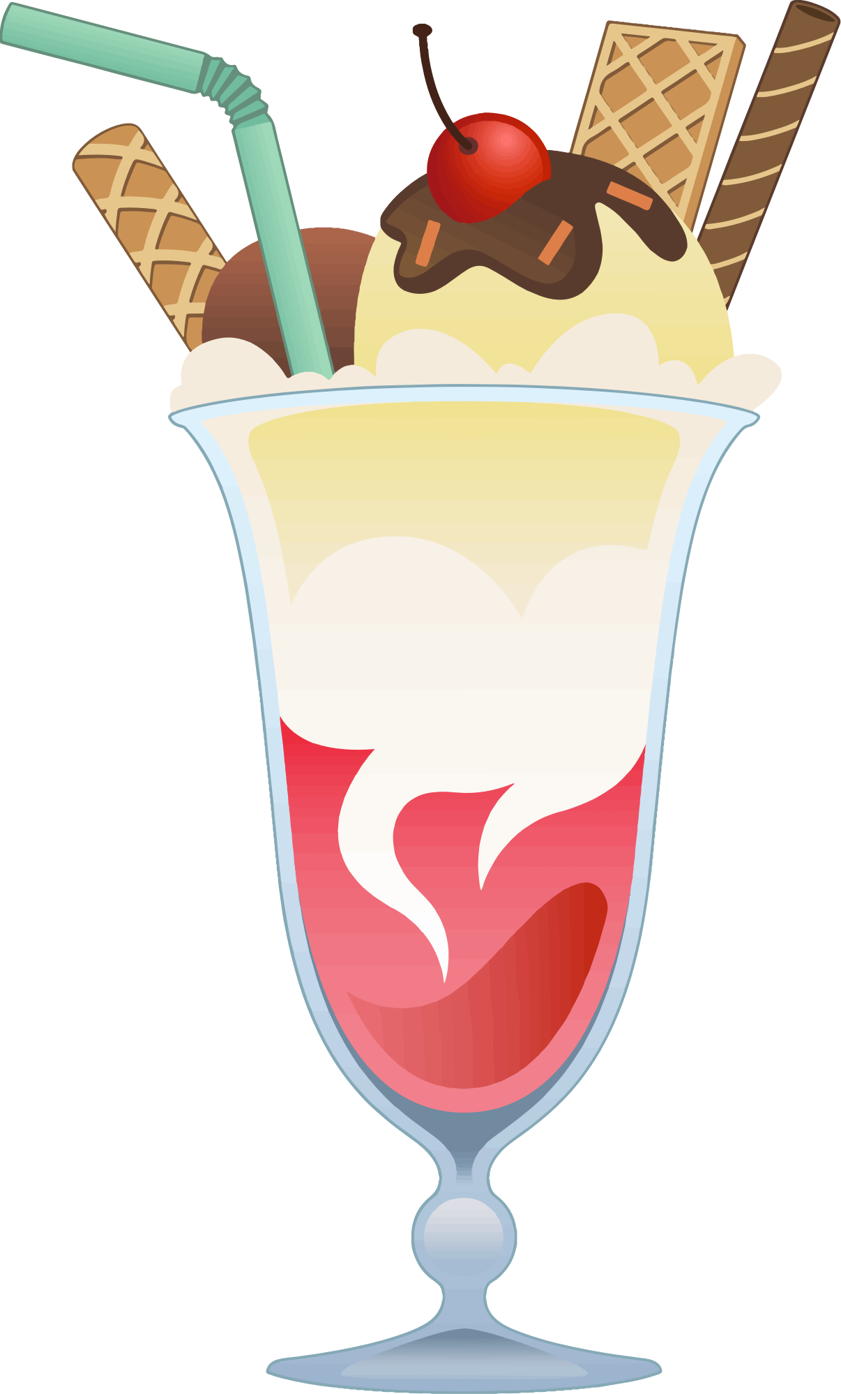 Ice cream sundae with cherry, wafer cookies and candy stick.