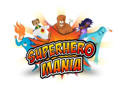 Superhero Mania logo for Vacation Kids Club. Remixed from multiple sources with some original stuff.