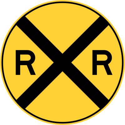 In the United States, this round yellow crossbuck sign will greet you several yards or meters before you reach the track. The design is from the Manual on Uniform Traffic Control Devices (MUTCD), W10-1, 2003 Edition. All images from the Manual are considered Public Domain. This image: courtesy of the Wikipedia Commons.