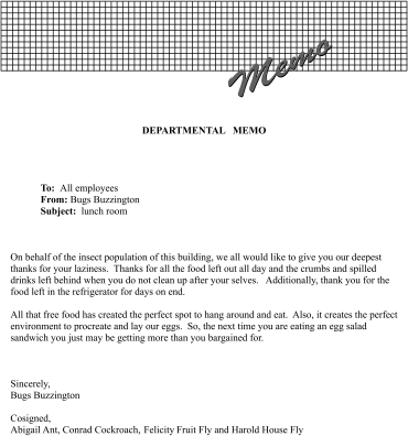 Joke/parody memo in reference to employees not cleaning up after them selves when using the lunchroom (lunch room).