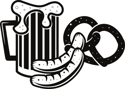 Black and white illustration of a pint of beer and a sausage.