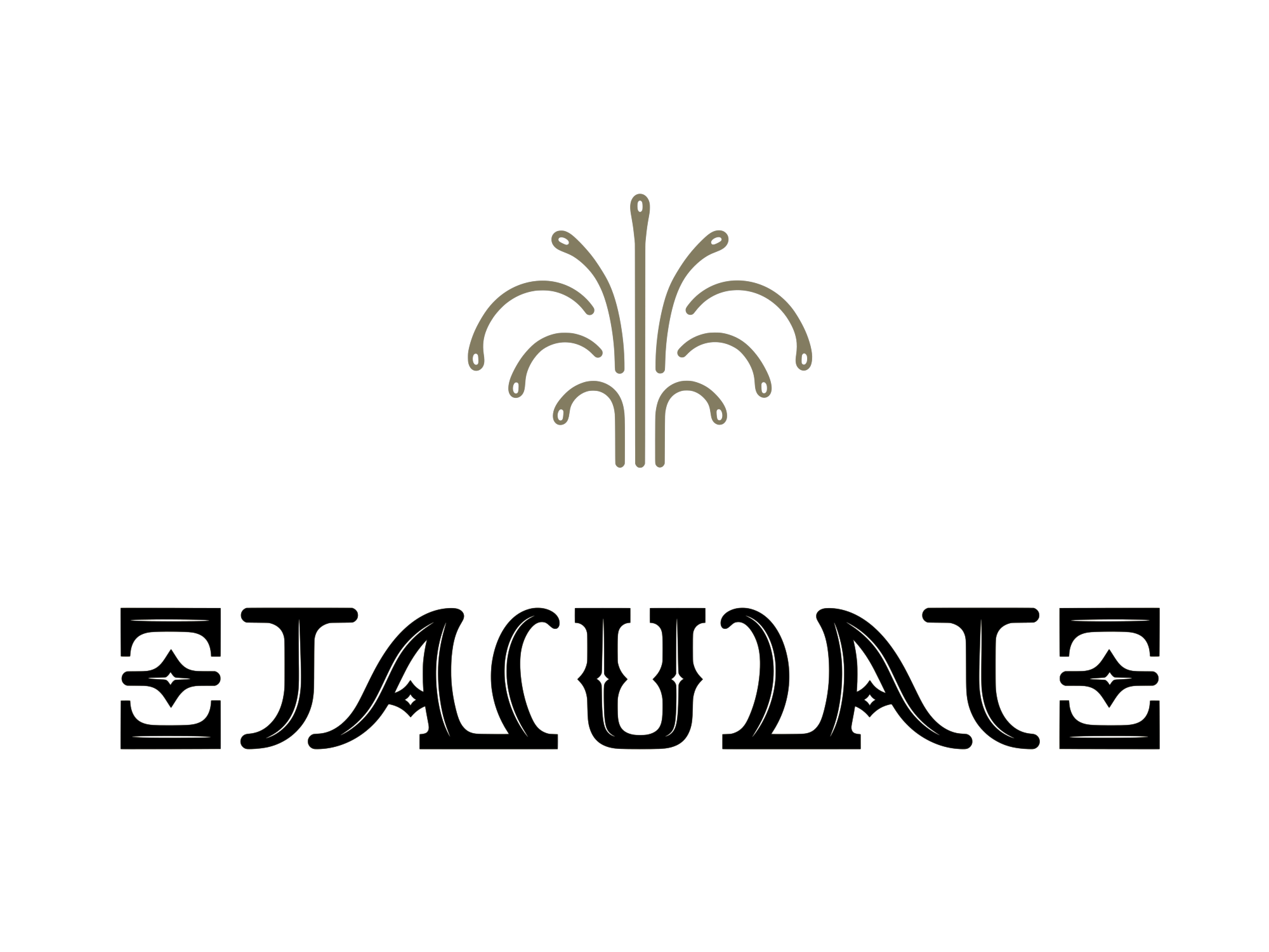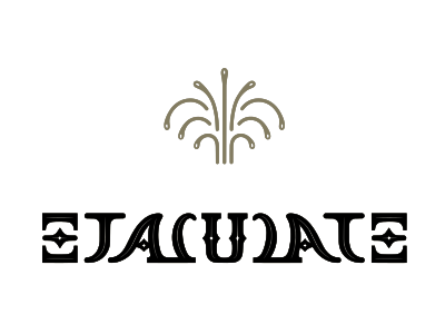 Ambigram ejaculate. This symmetrical word is supposed to read Ejaculate from left to right and from right to left. A fountain above can remind the semen splashing. The three letters E, A and U are naturally symmetric, while the J turns into a T, and the C into a L, specifically shaped to create this visual palindrome. There is a humorous intention behind this creation to provide an aesthetic object related to a taboo sexual action. This high resolution file can be printed on the paper for a specific publication, on the skin for a humorous tattoo, or on a t-shirt as a modern and trendy design.