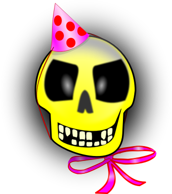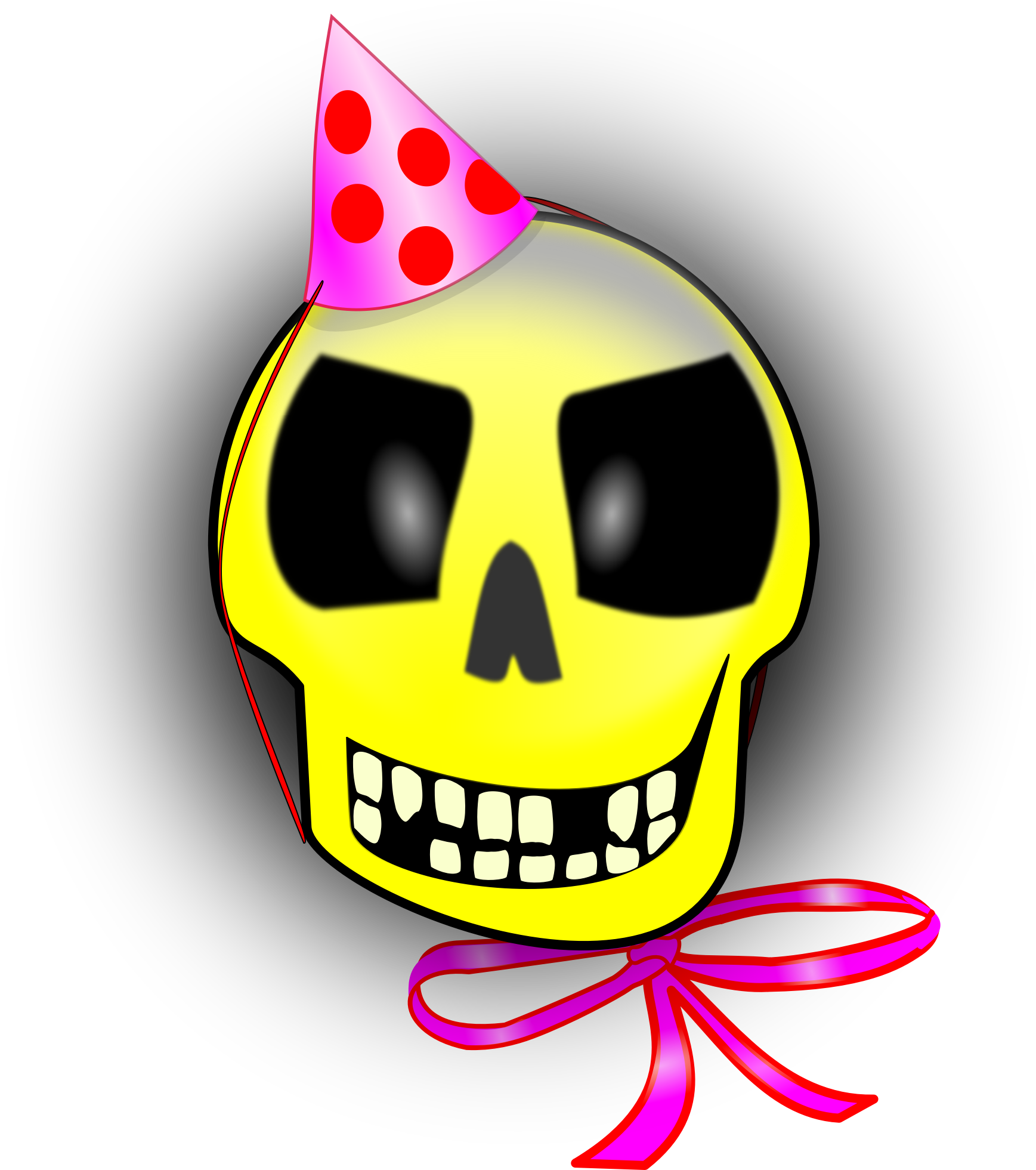 A yellow skull is smiling like some crazy emoticon. It wears a pink party head and a ribbon.