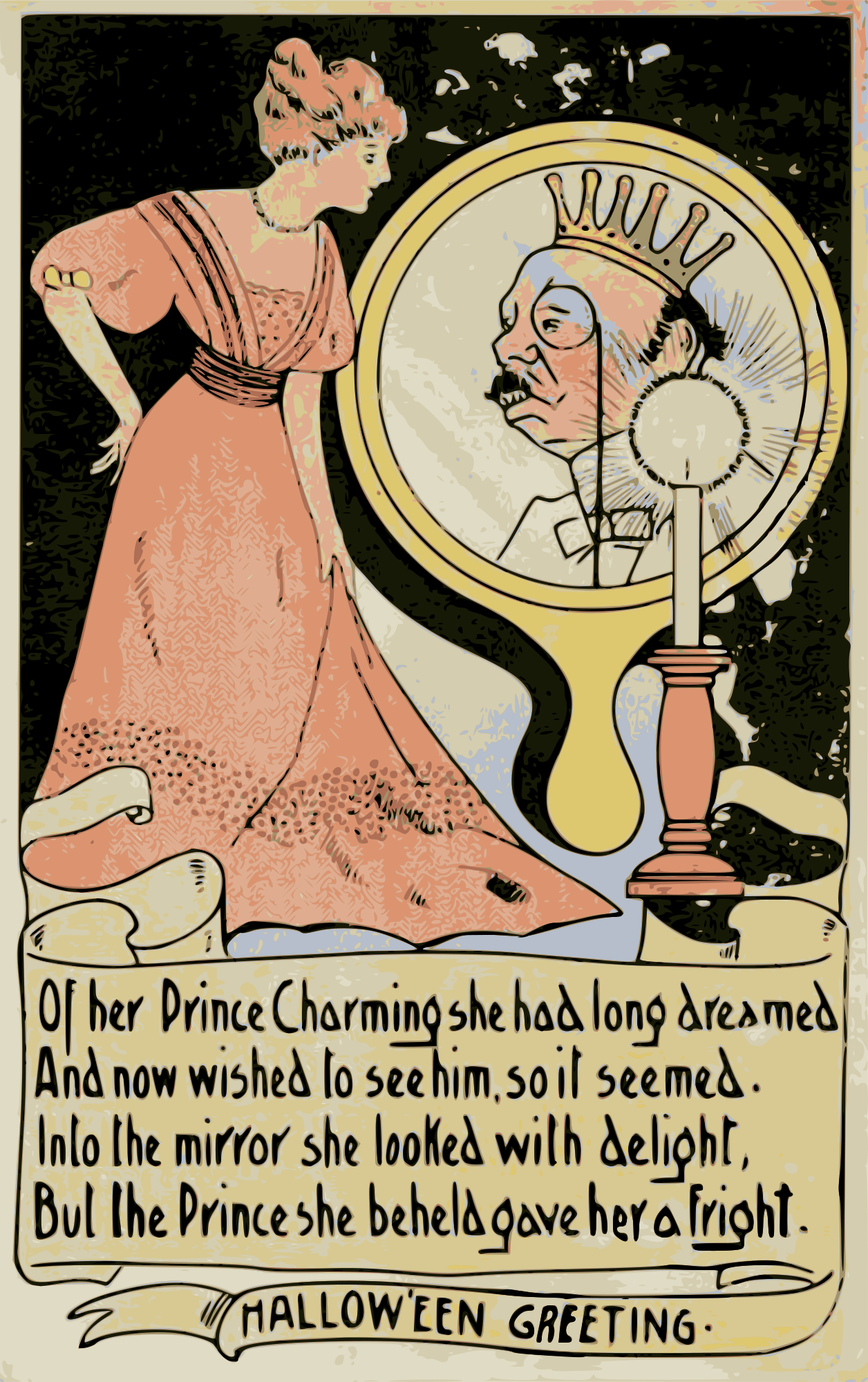 - broom card cards cute beautiful girl lady Halloween holiday ugly man prince magic mirror October old retro vintage mean 1908