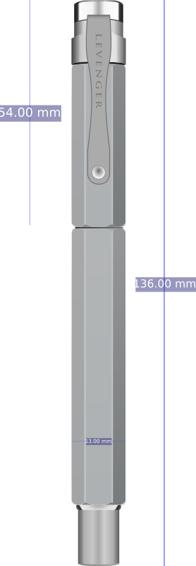 An Inkscape SVG hand drawn image of a Levenger L-Tech 3.0 chrome fountain pen with some of it's dimensions. Note that there's nothing drawn under the pen cap!