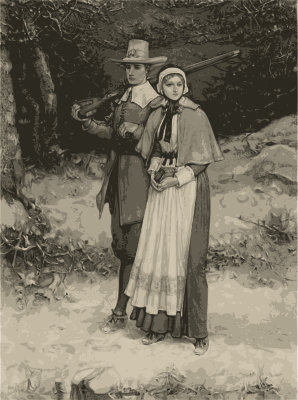- Puritans pilgrims couple man woman forest America American history rifle woods b_w 1885 Thanksgiving day holiday