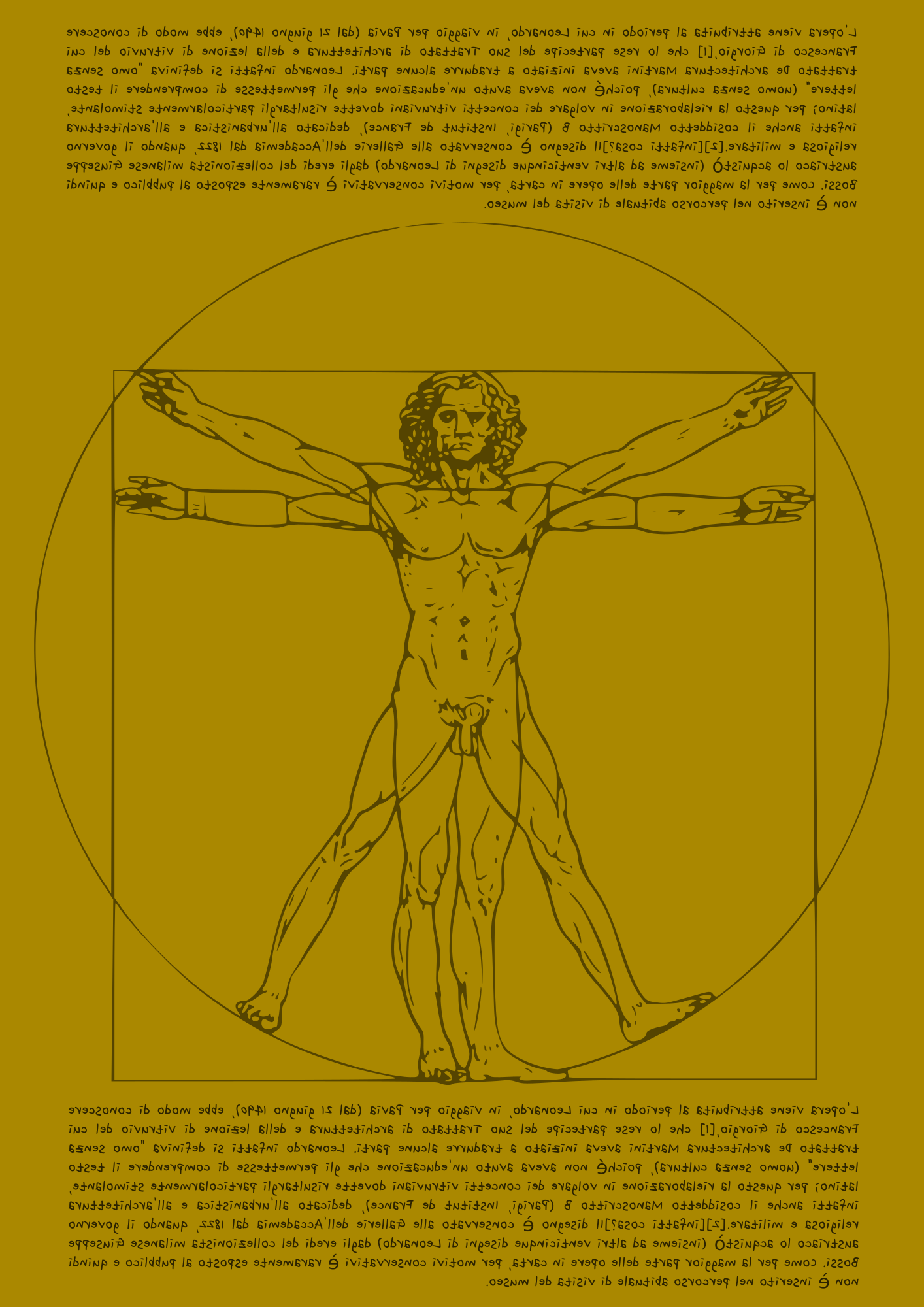 Rielaborazione del disegno "Leonardesco" dell'uomo vitruviano. Il testo รจ preso da Wiki, copiato, modificato nel carattere e invertito specularmente a mo' di scrittura di Leonardo Da Vinci.